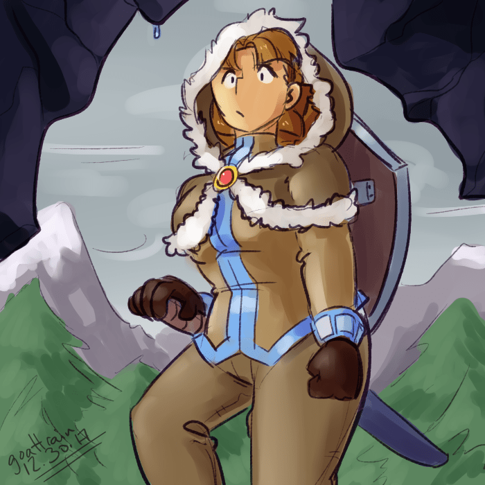 The next morning, she dressed with the help of her mother, donning furs and heavy boots to help keep away the cold. Her mother braided her hair securely, fastening a strand of cord from her own hair. With the sword at her hip, and her shield slung on her back with her provisions, she set off into the woods.